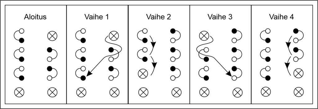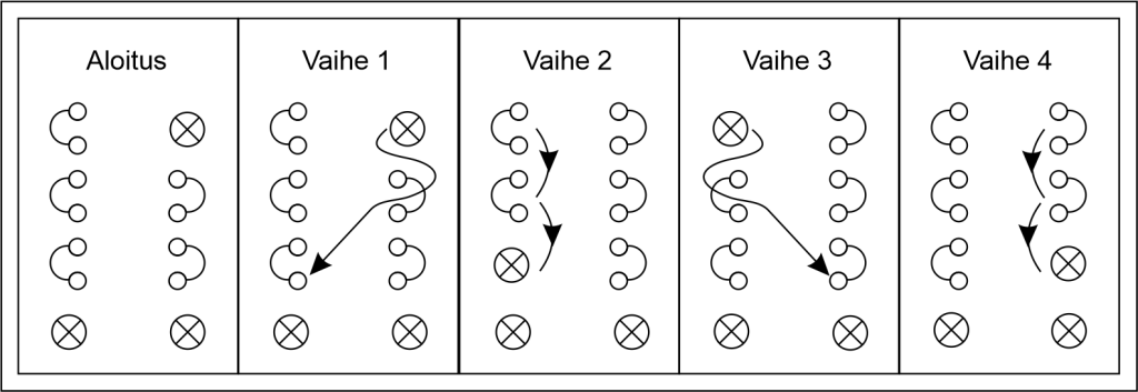 Kuten kaaviosta käy ilmi, tehdään sama asia vuorotellen vasemmalla ja oikealla eli oikeastaan tarvitsee muistaa vain kaksi liikettä. Huomaa, että toisen puolen alin pohjukka poimitaan kierrettynä eli koukataan aivan alin lanka. Tätä varten minä käännän passiivista kättä ulospäin, jotta pääsen helpommin käsiksi oikeaan lankaan.