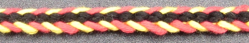 Jos nauhan pohjukoiden värit vaihtaa niin, että keskelle tulee yhtenäinen raita, on nauha yhtäkkiä aivan eri näköinen. Mallissani on kaksi keltaista, kaksi punaista ja kaksi mustaa pohjukkaa. Poiminnat ja vaihto ovat aivan samat kuin varsinaisessa ohranjyvänauhassa.