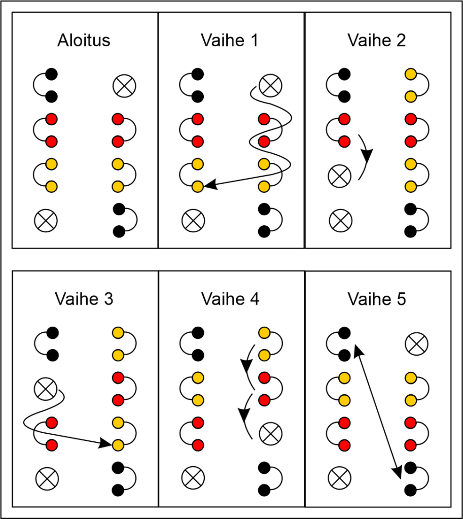 Huomaa, että vaiheessa 1 ja 3 pohjukat poimitaan kierrettynä. Vaiheet 1-4 tehdään vain reunavärillä, vaihe 5 vain keskiväreillä. Jos vaihdossa otat sisäpuolelta tulevan pohjukan kierrettynä, tulee “ohranjyvistä” selkeämpiä, mutta ero ei ole kovin suuri eikä vaihtotapa vaikuta nauhan onnistumiseen.