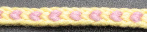 Tämä oma variaationi syntyi, kun eräässä nauhatyöpajassa huomautettiin, että nauhan keskellä olevat kuviot ovat kuin sydämiä. Kehitin ajatusta vähän pidemmälle ja huomasin, että jos toisen keskivärin korvaa reunavärillä, jäljellä olevasta keskiväristä tulee sydänrivi nauhan keskelle. Kuvan nauhassa on siis viisi keltaista ja yksi vaaleanpunainen pohjukka. “Sydämen” ulkonäkö muuttuu myös vähän riippuen siitä, tekeekö keskiviivan värejä vaihdettaessa sisempään pohjukkaan kierron vai ei. Voit myös kokeilla, mitä tapahtuu, jos sydämen muodostava pohjukka onkin paksumpaa lankaa kuin muut pohjukat.