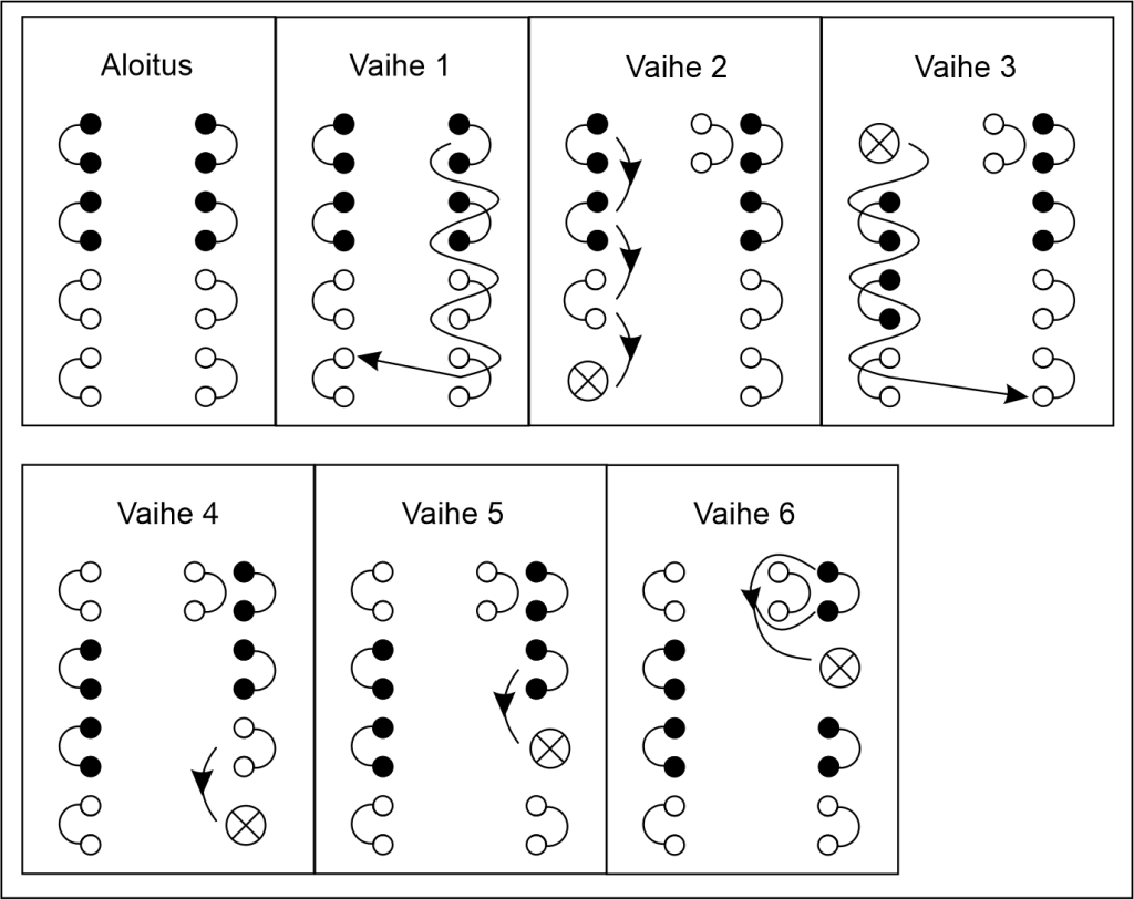 Vaihe kuusi oli se murheenkryynini. Poikkesin Benns & Barrettin merkinnästä ja kehitin nuolen, joka ehkä on selkeämpi. Käytännössä vaihe kuusi menee näin: Työnnä vasen etusormi oikealla etusormella olevan ulomman (ranteen puoleisen) pohjukan alle (kaaviossa musta) ja nosta pohjukka sisemmän (sormenpäiden puoleisen) pohjukan (kaaviossa vaalea) ylitse sisempään pohjukkaan koskematta. Laita nostettu pohjukka keskisormelle.