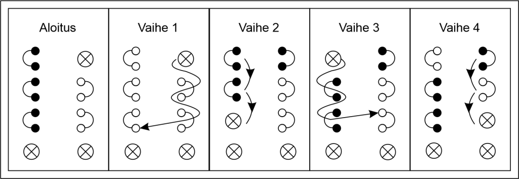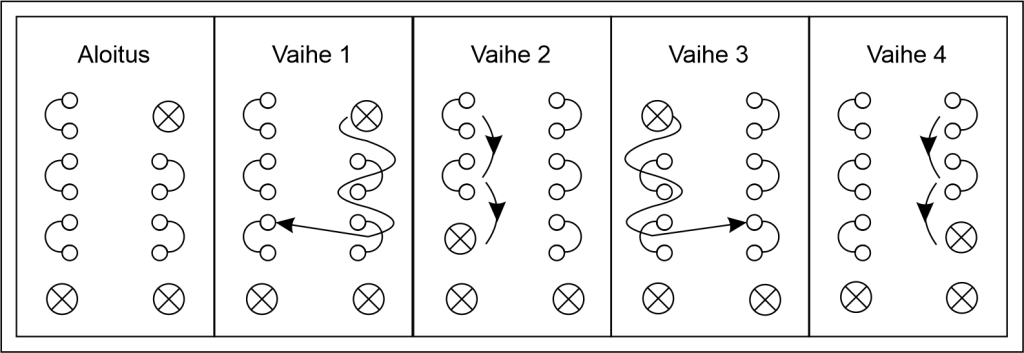 Kun poiminta tehdään kierrettynä, tuloksena on yksi pyöreä nyöri (A Round Lace). Kun poiminta tehdään avoimena, on tuloksena kahtia jakautuva An Open Lace. Jos toisella puolella poimii avoimena ja toisella kierrettynä, saa leveän ja ohuen nauhan. Tämäkin voi tekovaiheessa näyttää pyöreältä nyöriltä, mutta aukeaa sitten valmiina, jos ei ole tullut poimintavirheitä. On erittäin tärkeää, että keskityt poimimaan saman puolen aina samalla tavalla. Tässä kaaviossani oikea etusormi poimii pohjukan kierrettynä, vasen avoimena.
