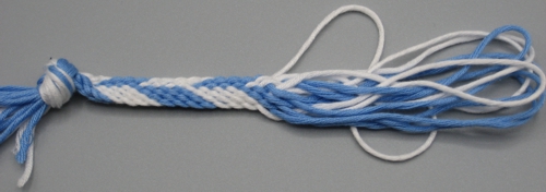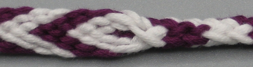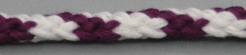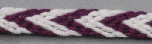 Jos pohjukoiden pitäminen pikkurilleillä tuntuu vaikealta, tämä nauha skaalautuu alaspäin, niin että voit käyttää myös kuutta pohjukkaa. Kokeilin vain litteää, mutta ei ole mitään syytä, miksi tätä ei voisi tehdä myös pyöreänä. Valokuvan nauhassa on neljä valkoista ja kaksi purppuraa pohjukkaa, kaaviossa on kolme eri väriä, jolloin raidoista tulee yhtä leveät.