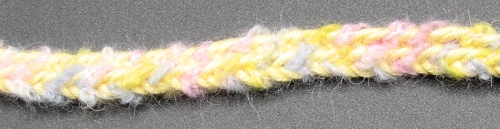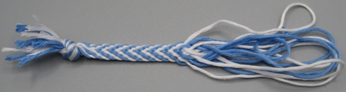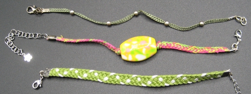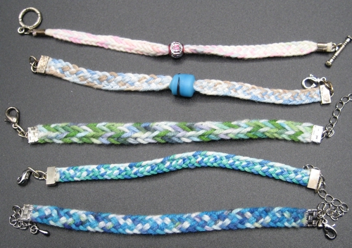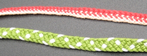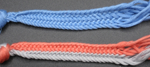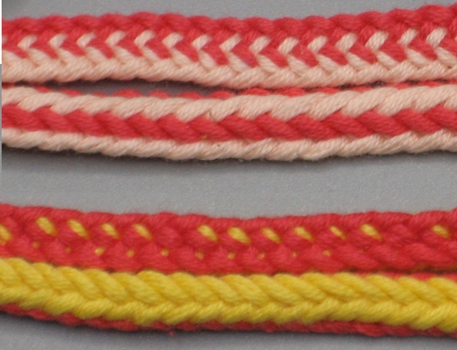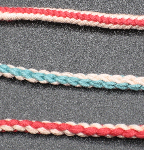 Pitkittäisraidallisen pyöreähkön nyörin saa aikaiseksi useammalla eri tavalla. Tässä kuvassa on ylinnä viiden pohjukan Lace Baston (tehdään kaksivärisillä pohjukoilla), Merisalon neljän pohjukan nauha 167 ja Merisalon neljän pohjukan nauha 168. Kaikissa on käytetty samaa lankaa ja ne on isketty suunnilleen yhtä tiukkaan.