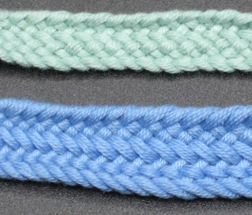 A Thin Lace of 5 Loops ja A Broad Lace of 7 Loops ovat rakenteellisesti samanlaisia, mutta pohjukkamäärä on eri, kuten nimistäkin näkyy. Kuvassa vihreä nauha on tehty viidellä pohjukalla, sininen seitsemällä. Lanka on molemmissa samaa laatua.