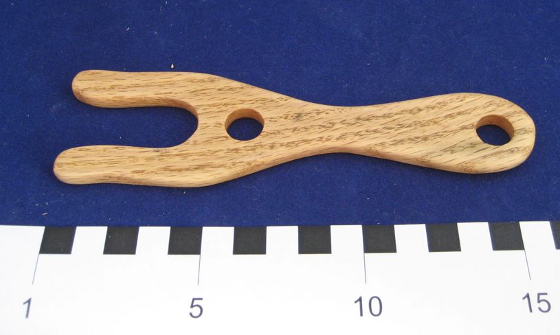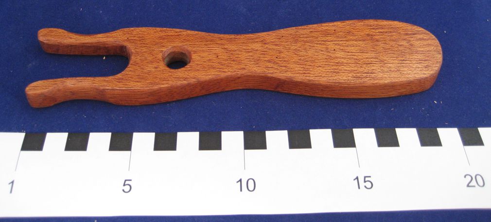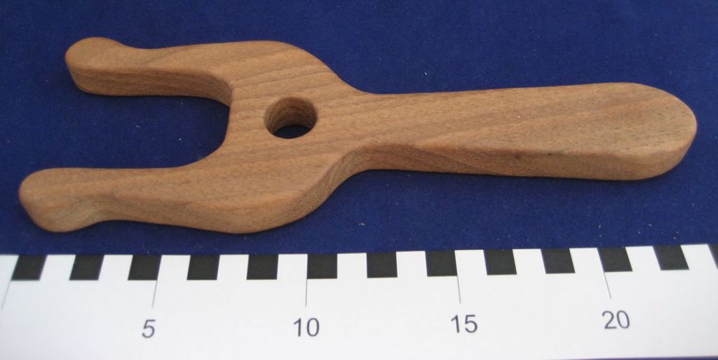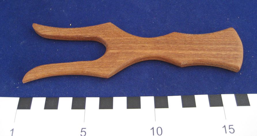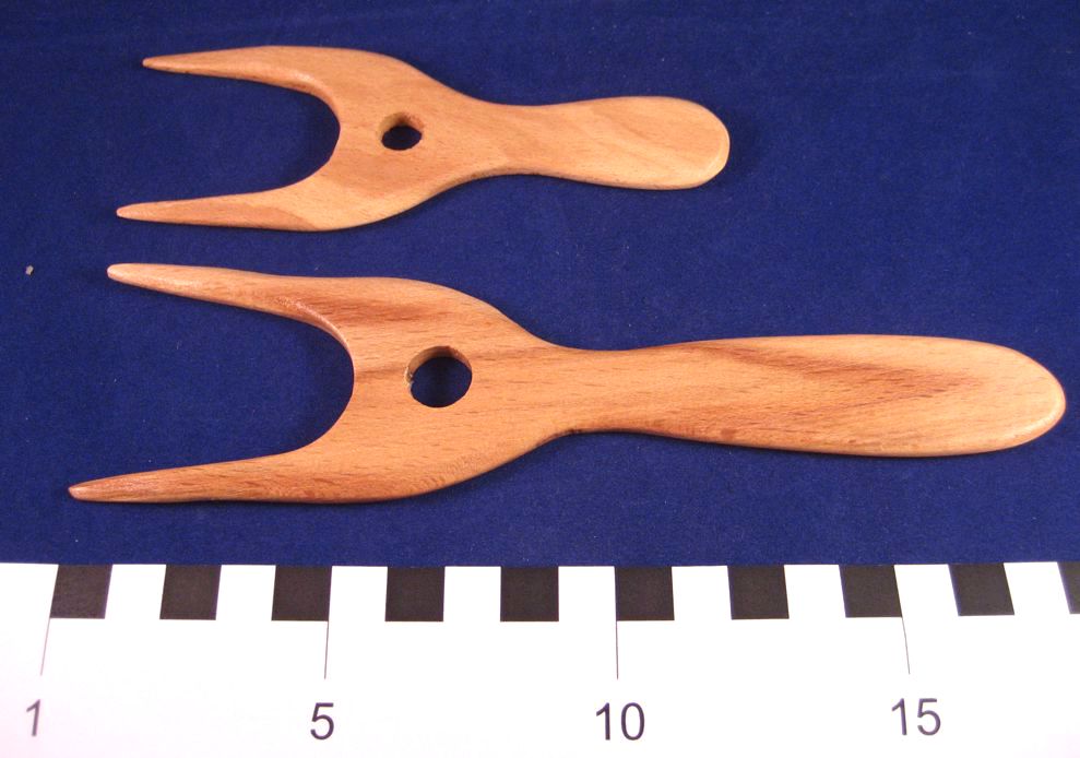 This narrowish lucet is made of mahogany. The horn shape is good, but the space between could be bigger. GoodShepFarm should be back in business in fall 2020, they might still be making these.