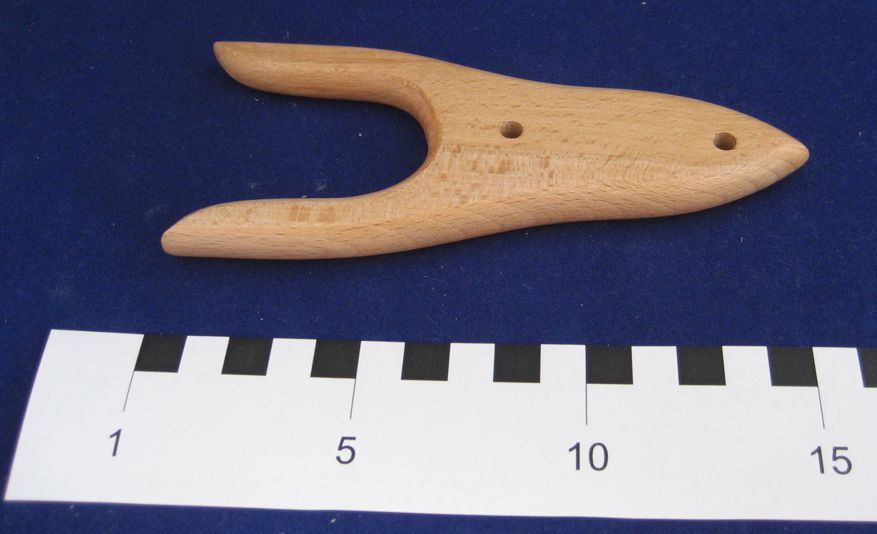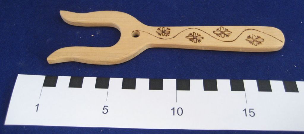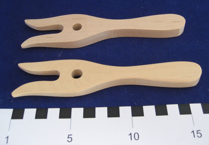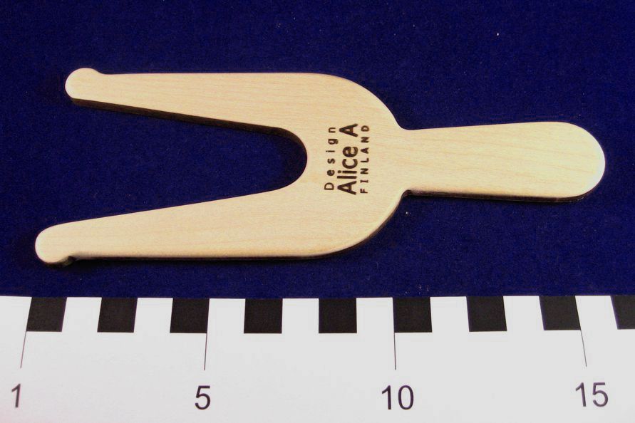 Tämä on Alice A:n isompi malli nykyisessä asussaan. Parannusta edelliseen on aika paljon, mm. hiomalla pyöristetyt reunat ja paremmat piikit. Tämä on jo vähän liian leveä minun käteeni, mutta toimii. Suomalaisesta koivusta tehdyn nyörihaarukan voi ostaa Lankavalta.